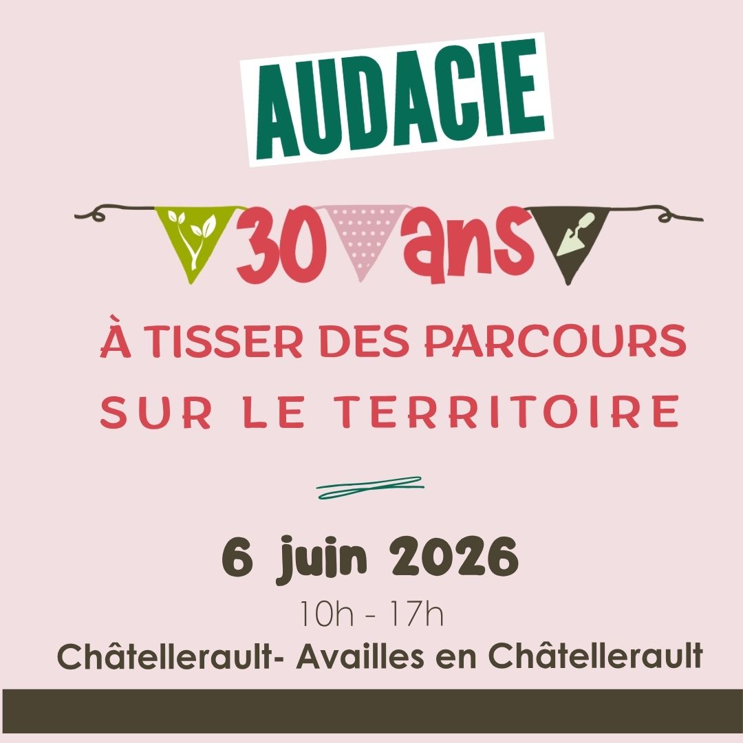 AUDACIE souffle ses 30 bougies ! Publication : Mercredi 15 Avril 2026Samedi 6 juin 2026, célébrons ensemble 30 ans d’audace et d’engagement. Journée portes ouvertes, visites de nos ateliers, stands de nos partenaires, animations… Lieu : Nos ateliers de Châtellerault et d’Availles en Châtellerault samedi 6 juin 10h-17h Plus d’infos très vite… Restez connectés !